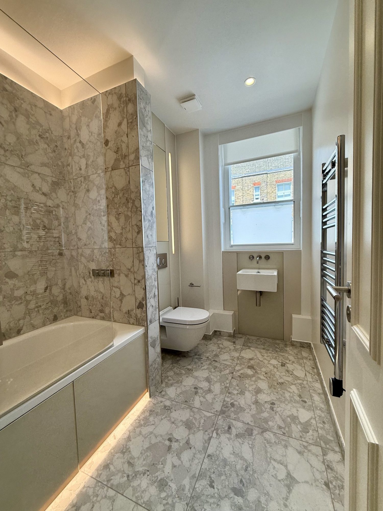 Works included new mechanical and electrical installations, full re-levelling and reinstatement of high-quality timber and tiled flooring, a fully refurbished bathroom and kitchen, bespoke bedroom joinery, and complete redecoration — including communal areas from ground to third floor